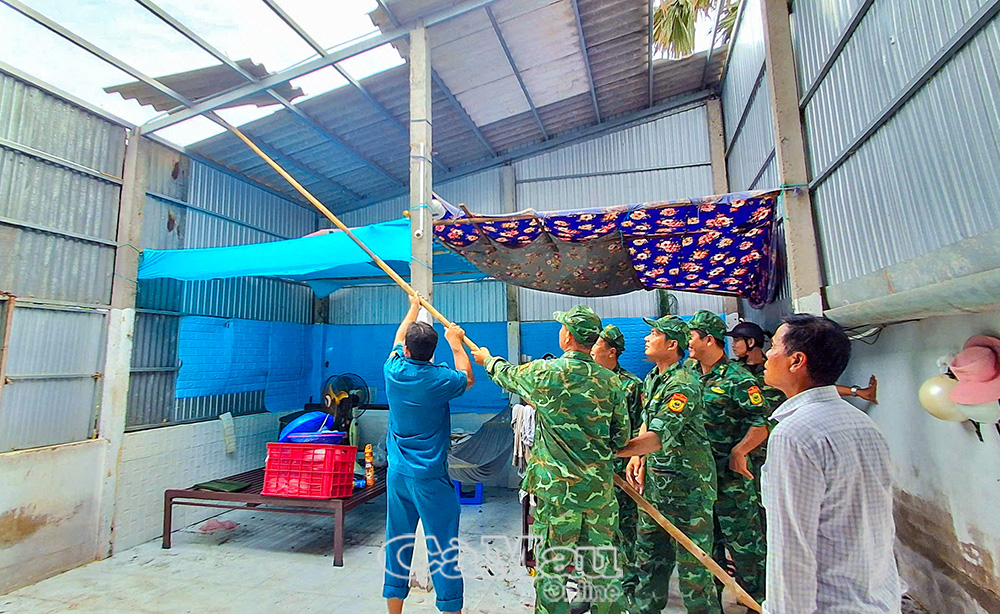 Lực lượng vũ trang địa phương giúp các hộ dân dọn dẹp nhà cửa, thu gom các mảnh tôn vỡ sau lốc xoáy.