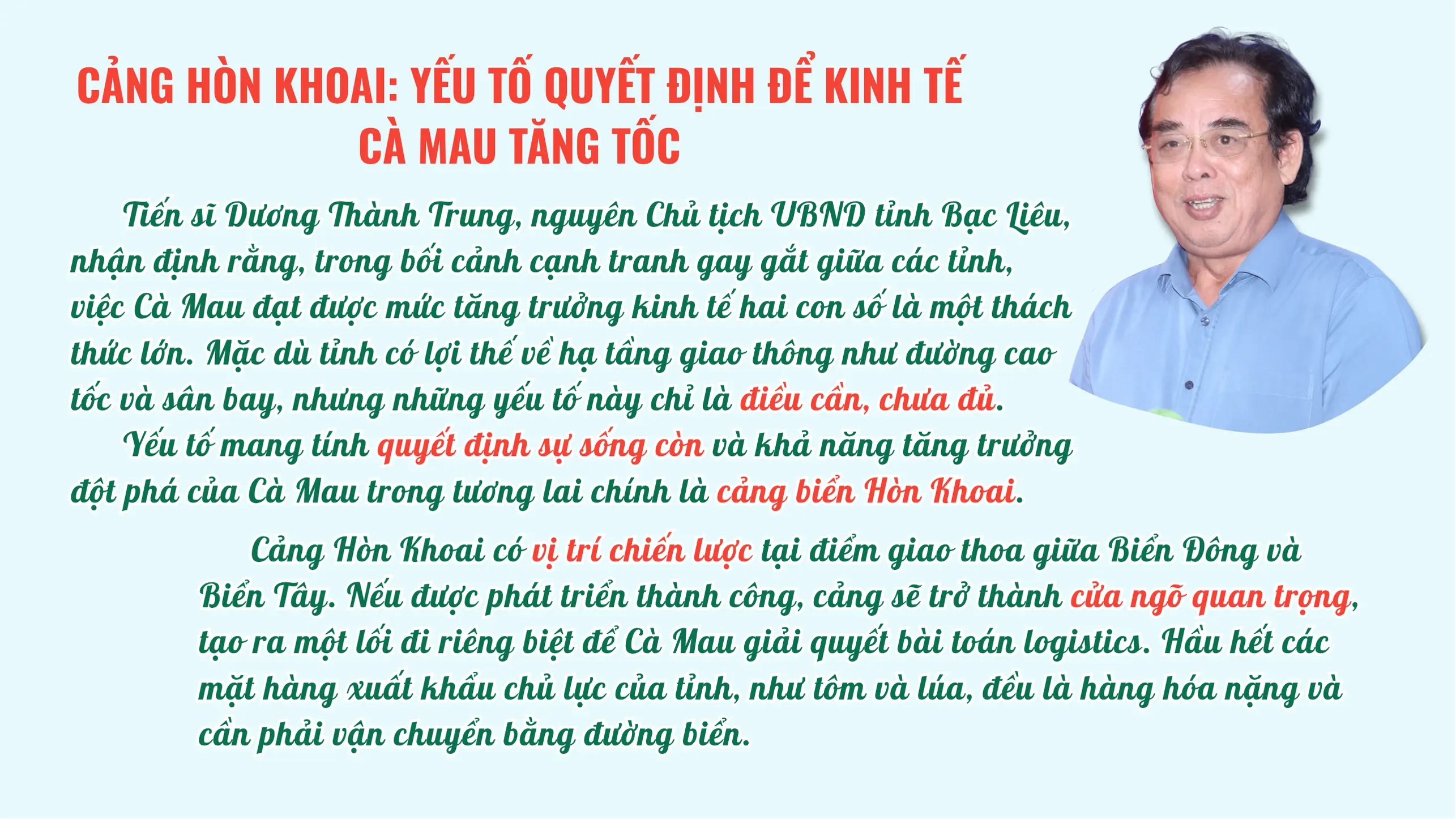 Vị trí địa lý chiến lược: Với đường bờ biển dài, nằm trên tuyến đường hàng hải quốc tế quan trọng, đáng chú ý là ở ngay vị trí “mặt tiền” kênh đào Kra Isthmus (Thái Lan) hình thành trong tương lai, Cà Mau trở thành cửa ngõ giao thương quan trọng của khu vực.
