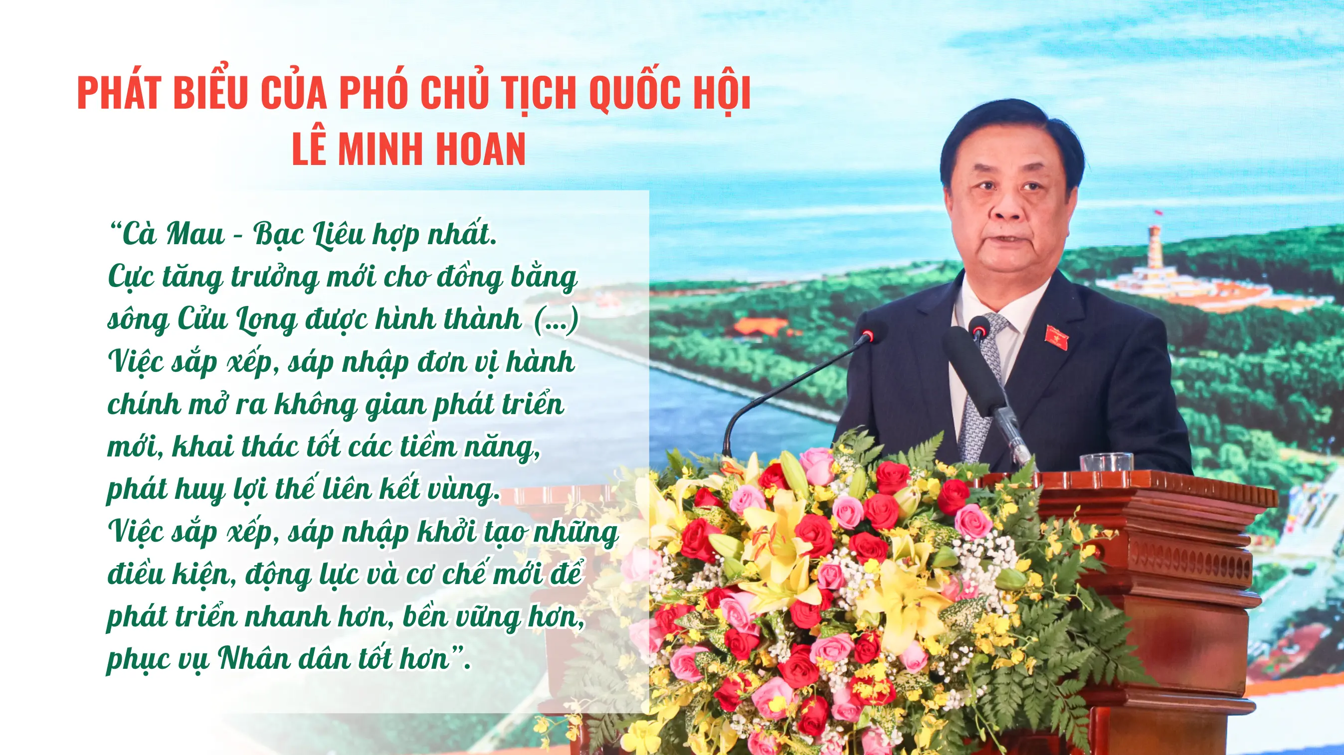 Tại Lễ công bố nghị quyết, quyết định của Trung ương và địa phương về sắp xếp đơn vị hành chính cấp tỉnh, cấp xã do tỉnh Cà Mau tổ chức ngày 30/6/2025, đồng chí Lê Minh Hoan, Phó Chủ tịch Quốc hội (hàng đầu, thứ tư từ phải qua) đã trao Quyết định 2162 của Bộ Chính trị và tặng hoa chúc mừng Ban Chấp hành Đảng bộ tỉnh Cà Mau.