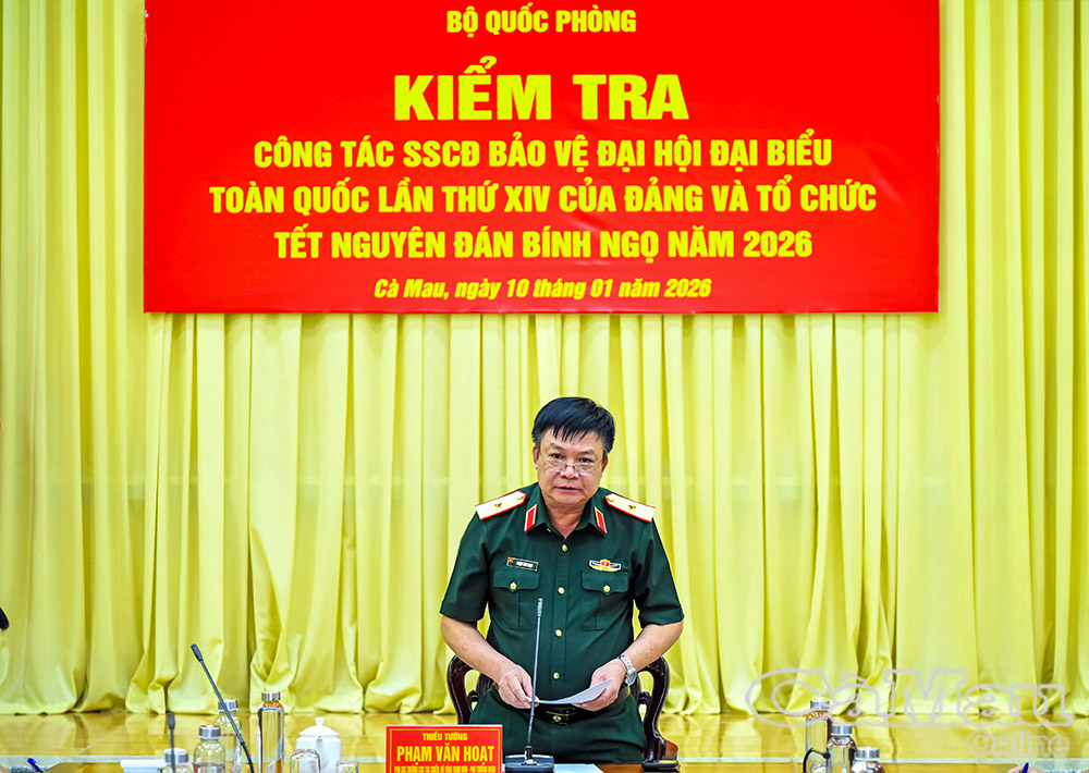 Ngày 10/1, Đoàn công tác Bộ Tổng Tham mưu Quân đội nhân dân Việt Nam do Thiếu tướng Phạm Văn Hoạt, Phó Cục trưởng Cục Tác chiến, Bộ Tổng Tham mưu, làm trưởng đoàn, đã tiến hành kiểm tra công tác sẵn sàng chiến đấu (SSCĐ) bảo vệ Đại hội Đại biểu toàn quốc lần thứ XIV của Đảng và công tác tổ chức Tết Nguyên đán Bính Ngọ năm 2026 tại Bộ Chỉ huy Quân sự (CHQS) tỉnh và Ban Chỉ huy Bộ đội Biên phòng tỉnh Cà Mau.