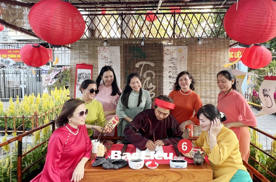 Tết về, mọi người xúng xính quần áo đẹp xuống phố, đến các điểm vui chơi, đi “Chợ quê ngày Tết” để check-in, cảm nhận hương sắc Tết (ảnh 5). Tô điểm cho nàng xuân thêm rạng rỡ là hình các chị em thướt tha trong tà áo dài đi du xuân, xin chữ đầu năm (ảnh 6).
