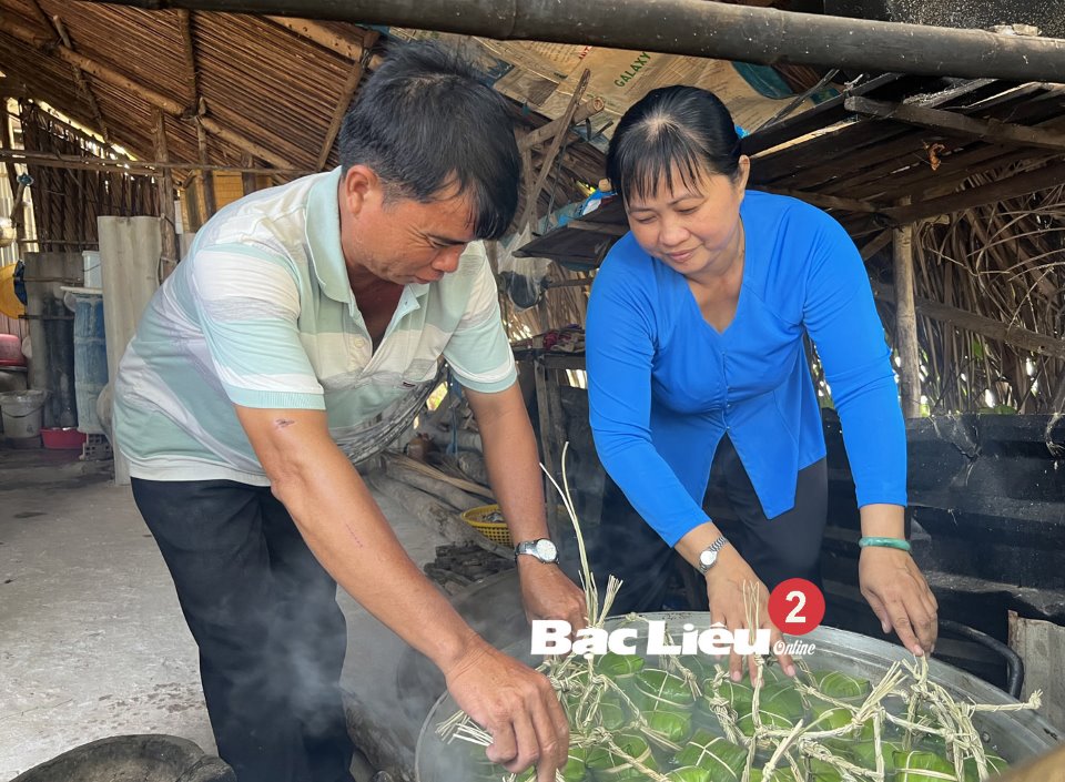 Trong những ngày Tết, khắp phố phường trong tỉnh được trang hoàng nhiều tiểu cảnh, đèn Led mang biểu tượng mừng Đảng, mừng Xuân đã khoác lên quê hương Bạc Liêu “chiếc áo” lộng lẫy (ảnh 1). Đó cũng là lúc dưới những hiên nhà, nhiều gia đình háo hức chuẩn bị bánh mứt, không thể thiếu là gói bánh tét đón Tết (ảnh 2).