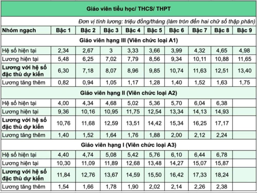 Bảng lương giáo viên mới với hệ số đặc thù dự kiến như sau: