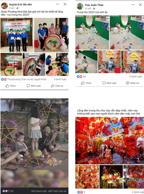 Một mùa Trung thu nữa lại về. Mấy ngày qua, không khí vui tươi của tết Trung thu ngập tràn từ trong nhà đến ngoài phố và cả trên mạng xã hội. Những hình ảnh về các chương trình vui hội trăng Rằm với nhiều tiết mục văn nghệ, trò chơi vui nhộn; màn trình diễn đèn lồng hoành tráng; tung tăng xuống phố rước đèn… được cư dân mạng thi nhau chia sẻ. Bên cạnh đó, trên trang Facebook, Zalo cá nhân của mình, nhiều người đăng tải hình ảnh đón Trung thu ấm áp của gia đình như nhằm gửi đến mọi người thông điệp “tết Trung thu là tết của tình thân”.