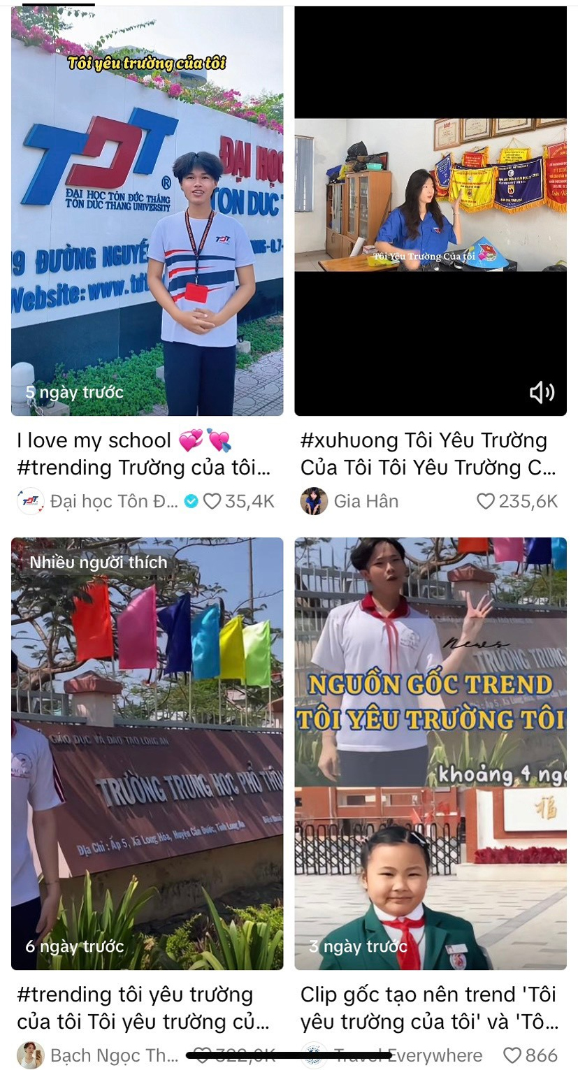 “Tôi yêu trường của tôi” đang là chiếc trend hot nhất mạng xã hội TikTok, Facebook trong những ngày gần đây. Các bạn học sinh - sinh viên đua nhau bắt trend bằng cách đứng trước trường học, bày tỏ tình yêu đối với ngôi trường mình đang học tập theo mẫu có sẵn: “Tôi yêu trường của tôi. Tôi có thể yêu trường của tôi 4 ngày: ngày xuân, ngày hạ, ngày thu và ngày đông. Tôi yêu trường của tôi có thể là 3 ngày thôi: ngày hôm qua, hôm nay và ngày mai. Tôi yêu trường của tôi có thể 2 ngày thôi: ngày chẵn và ngày lẻ. Tôi yêu trường của tôi 1 ngày là đủ: mỗi ngày” (nhưng cũng có những bạn biến tấu lời bình này cho phù hợp với ngôi trường của mình).