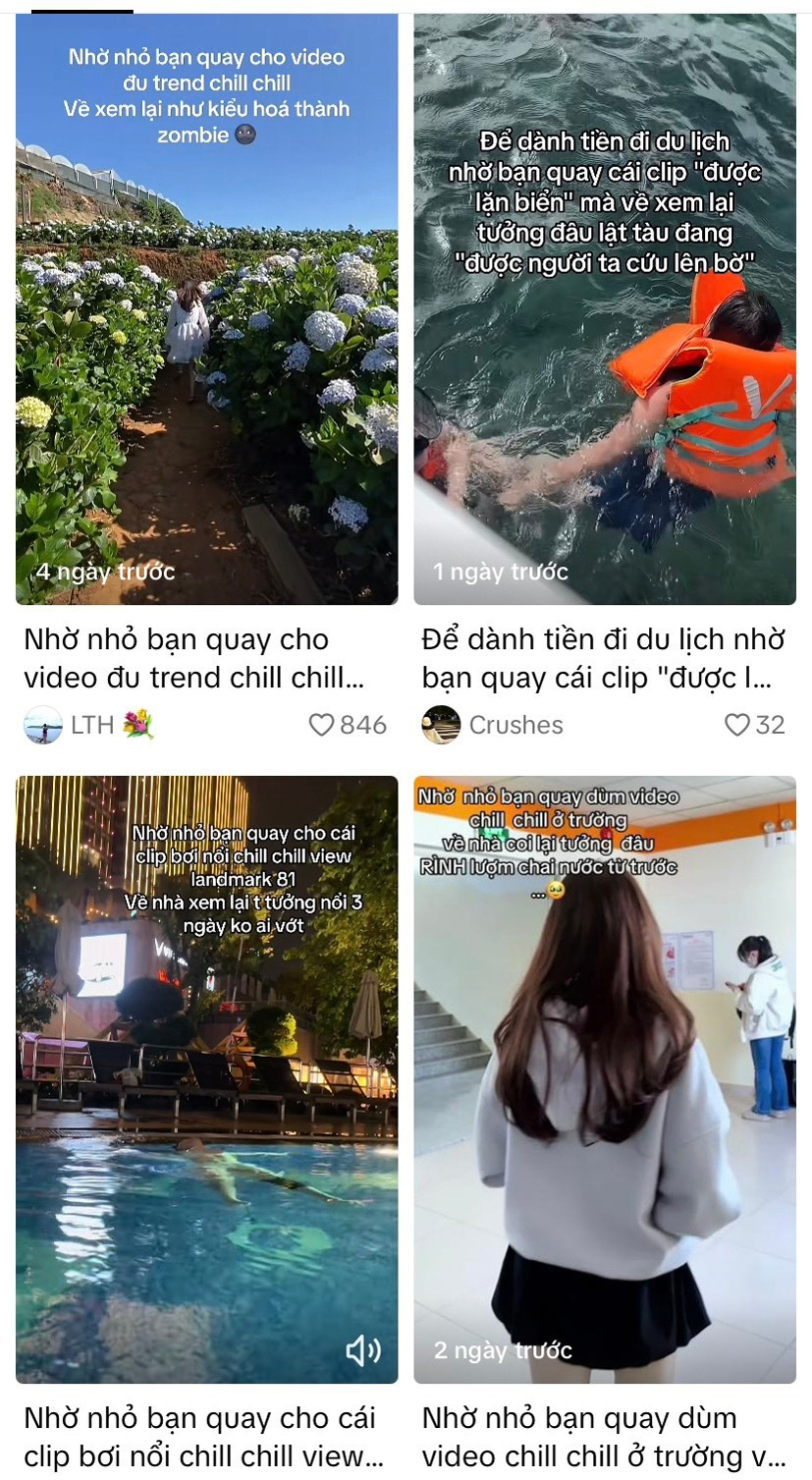 Từ việc đi du lịch, đi hát karaoke, thưởng thức ẩm thực…, nhưng qua bàn tay ghi hình của bạn bè (vợ/chồng) thì chill chill đâu không thấy, chỉ thấy chủ nhân của các đoạn video clip, những bức ảnh bỗng dưng hóa thành người đi móc cống, móc bọc, đi vượt biên, xuất khẩu lao động, kẻ lang thang đi bụi, công nhân tan ca ngồi ăn… Có thể thấy, để có được những hình ảnh lung linh “sống ảo”, không chỉ cần khung cảnh thơ mộng, “người mẫu” đẹp, mà còn phụ thuộc rất nhiều vào người quay phim, chụp hình. Chỉ là kiểu quay video, chụp hình không có miếng tâm nào, thế mà giờ đây lại trở thành trào lưu được các bạn trẻ hưởng ứng nhiệt tình.