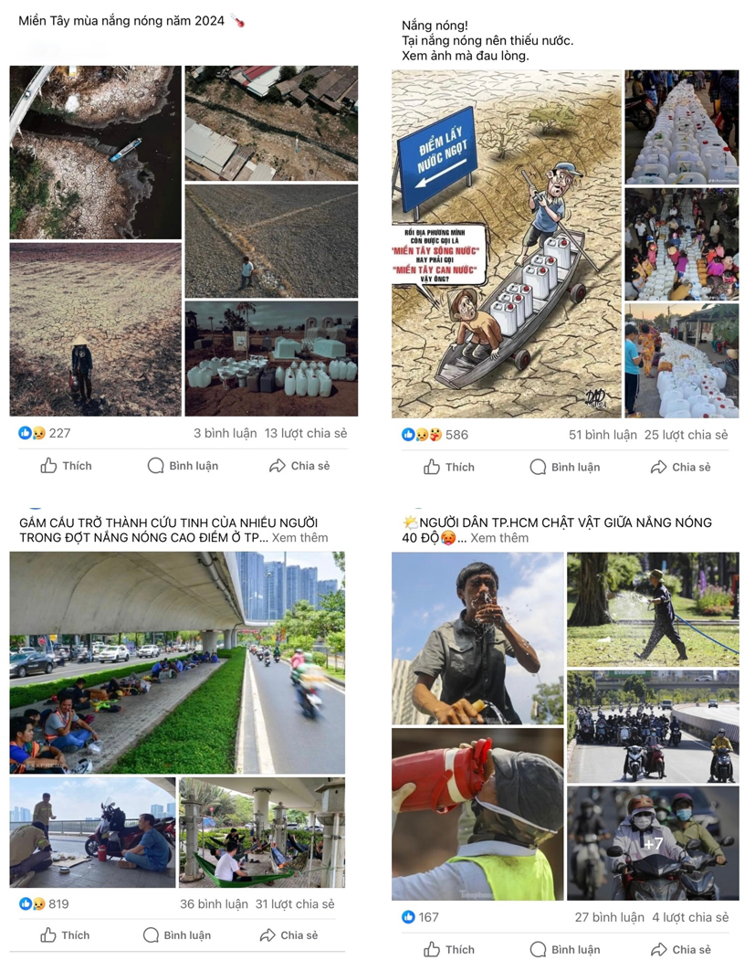 Rất nhiều hình ảnh đăng tải trên các mạng xã hội Facebook, Zalo cho thấy tình trạng thiếu nước ngọt, đồng ruộng khô cằn nứt nẻ… đang xảy ra ở nhiều nơi. Đặc biệt là hình ảnh người dân đang phải vất vả mưu sinh trong cái nắng rát da thịt, cũng như “vật lộn” tìm đủ mọi cách chóng chọi với nắng nóng như: xuống gầm cầu nghỉ mát, mắc võng nằm dọc bờ sông, bày nhau cách làm các món ăn, đồ uống để hạ nhiệt… Tuy nhiên, bên cạnh những hình ảnh mang tính chất “than trời” thì cũng có những hình ảnh vô cùng hài hước: lấy chảo để ngoài trời nắng để làm món trứng ốp la, “sáng chế” quạt phun sương giải nhiệt từ chiếc quạt gió truyền thống và đá lạnh, so sánh hình ảnh làn da trước và sau khi đi du lịch…
