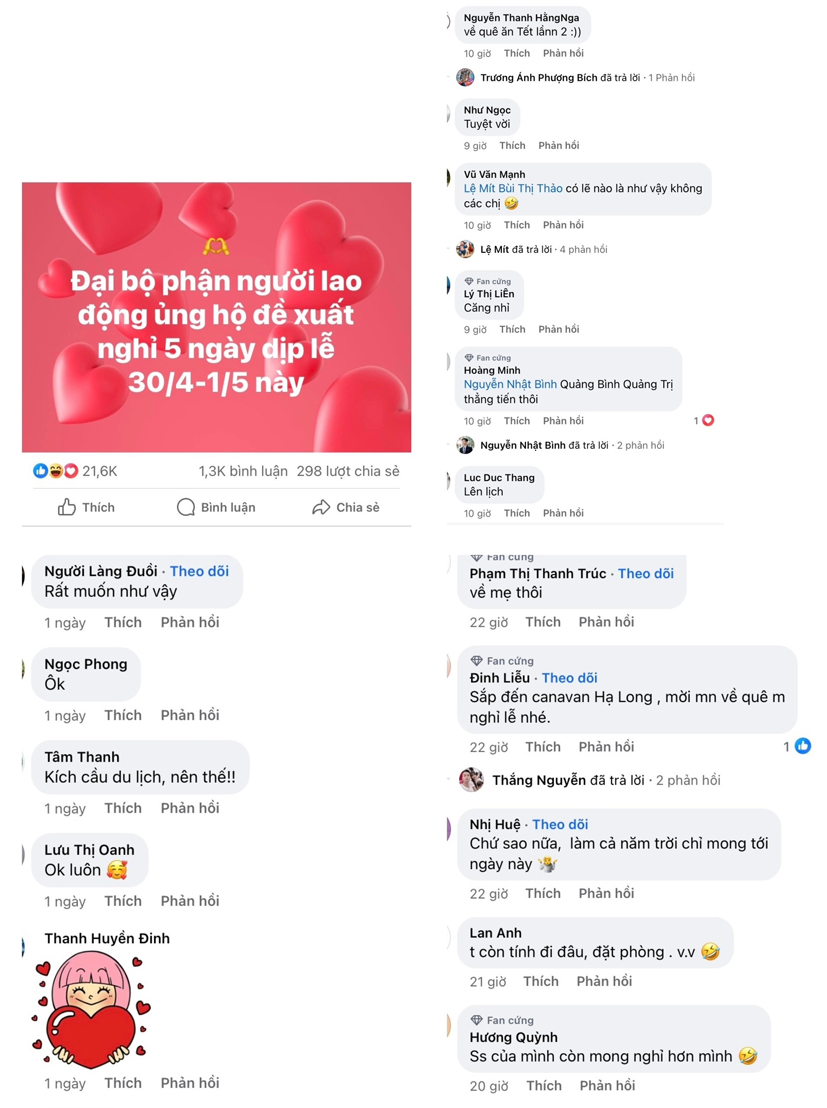 Trước thông tin Bộ LĐ-TB-XH chốt phương án hoán đổi ngày làm việc để nối liền 5 ngày nghỉ dịp lễ 30/4 - 1/5 và trình Thủ tướng Chính phủ xem xét phê duyệt, ngay lập tức, trên các diễn đàn, hội nhóm Facebook, Fanpage… có vô số những dòng trạng thái, bình luận tỏ ra phấn khởi, vui mừng. Hầu hết các ý kiến cho rằng đây là phương án hợp lý, vì sẽ làm bù vào ngày khác chứ không phải chỉ nghỉ mà không làm, nên sẽ không thay đổi quỹ thời gian làm việc.