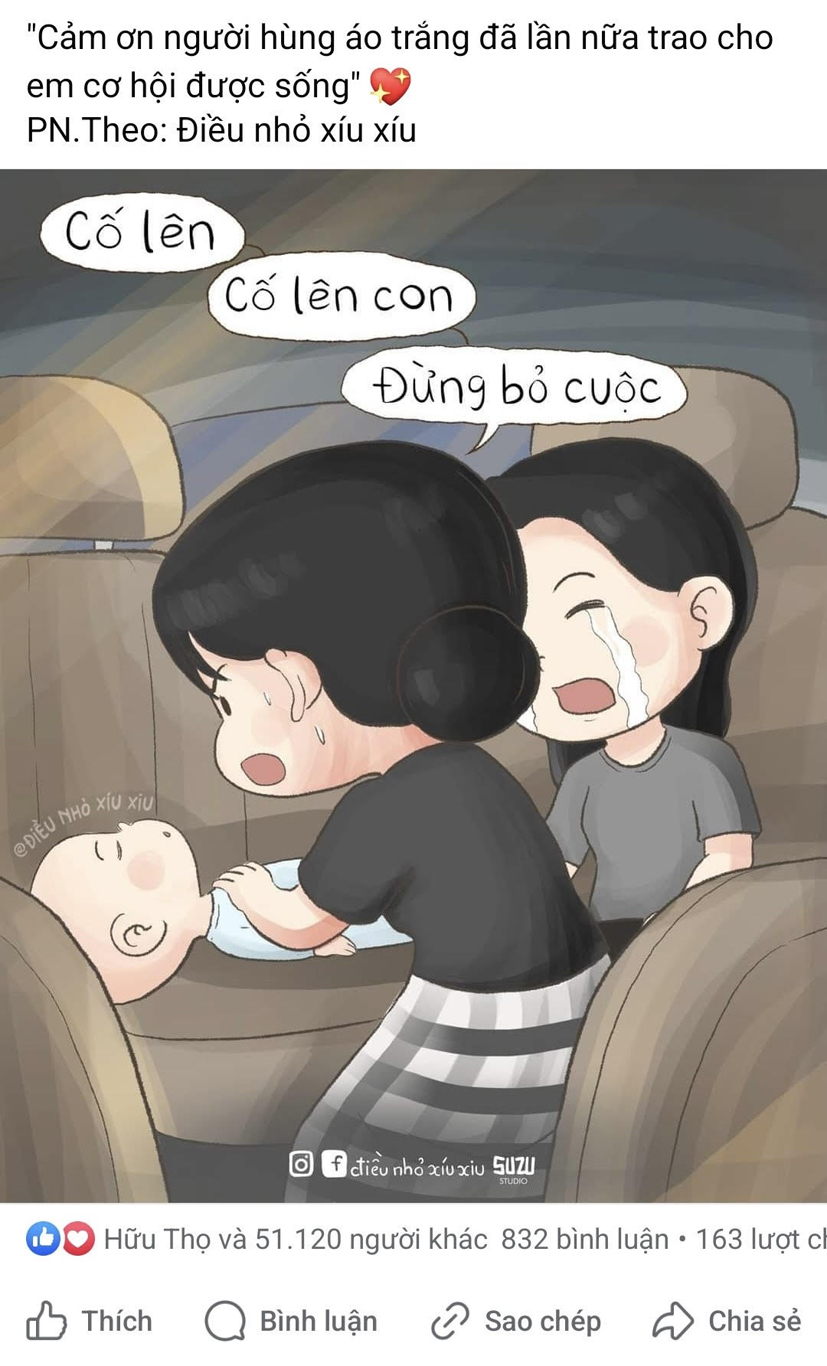Hình vẽ mô phỏng lại cảnh nữ điều dưỡng cấp cứu cho bé sơ sinh bị sặc sữa, ngừng thở trên xe taxi nhận được hàng chục ngàn nhiều lượt yêu thích của cộng đồng mạng. Ảnh: Nguồn Facebook