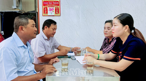 Chị Nguyễn Thị Mỹ Nhân, Chuyên viên XKLĐ phường (bìa phải) cùng Trưởng khóm Trương Văn Chiểu (thứ hai từ trái sang) thăm gia đình anh Lê Quốc Nghị, có con đang làm việc tại Nhật Bản.