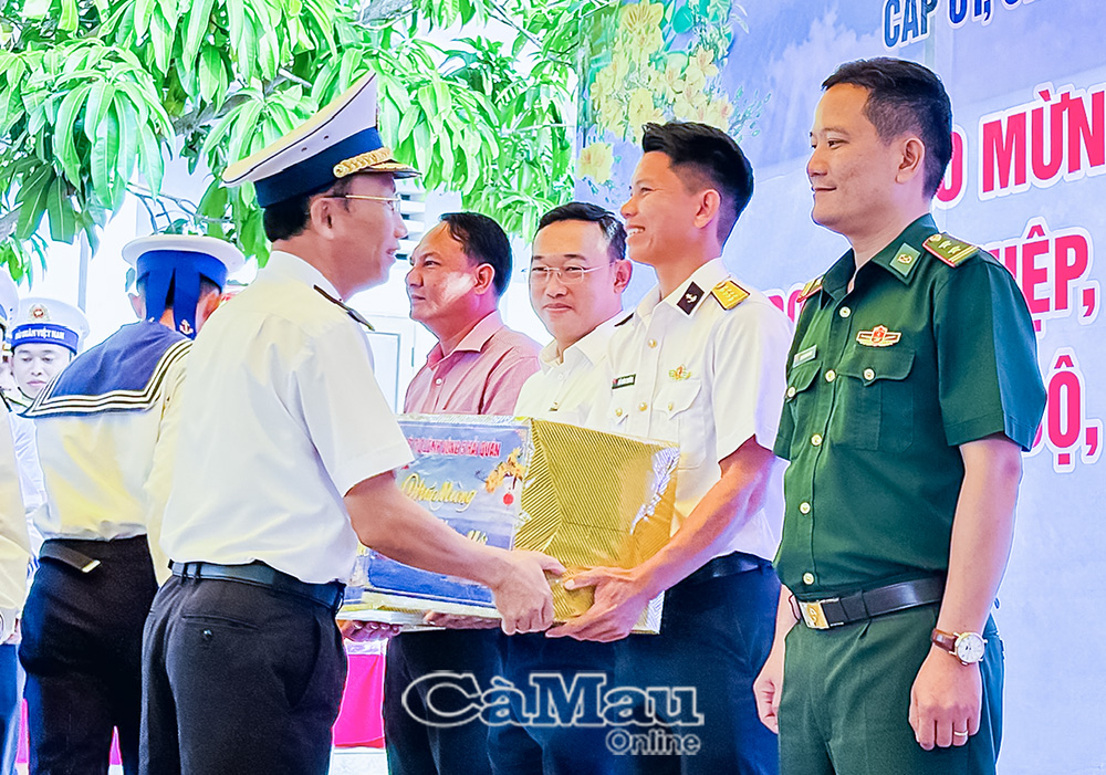 Đồng chí Bùi Minh Hải, Phó Chủ tịch Uỷ ban MTTQ Việt Nam tỉnh Cà Mau trao quà cho cán bộ, chiến sĩ đang làm nhiệm vụ trên đảo Hòn Đốc.