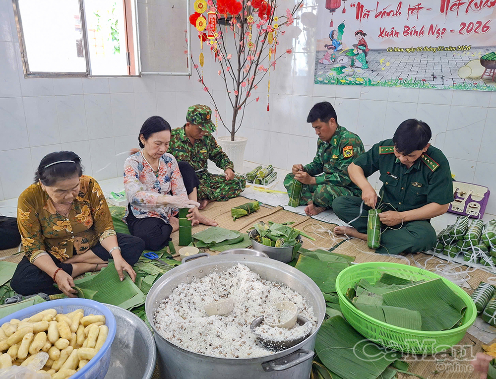 Cán bộ, chiến sĩ Đồn Biên phòng Khánh Hội cùng bà con địa phương quây quần gói bánh tét, đây là hoạt động ý nghĩa mở đầu Chương trình “Xuân Biên phòng ấm lòng dân bản” năm 2026.