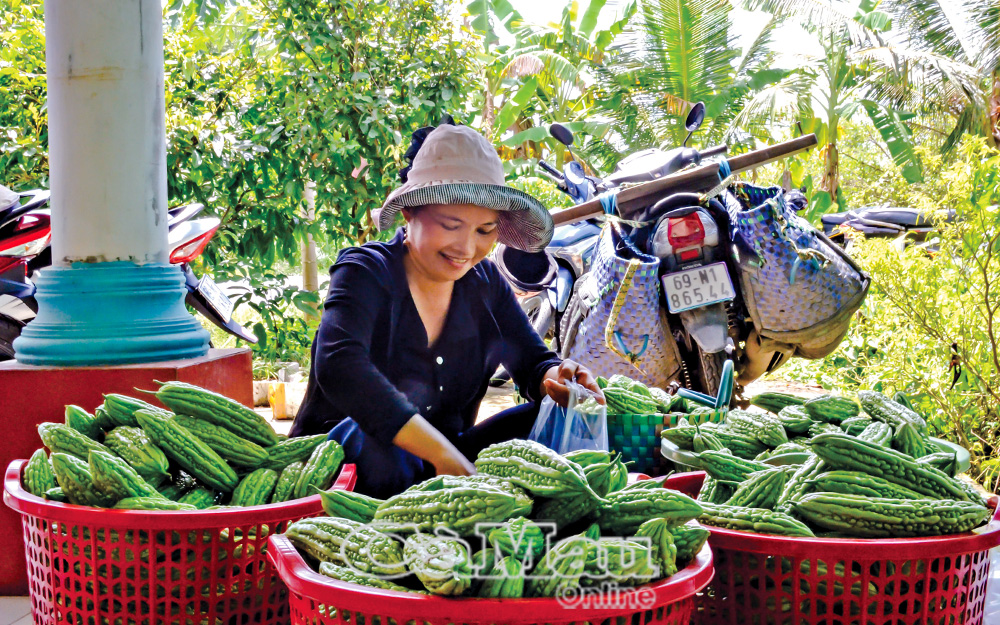 Hộ ông Võ Thành Quốc, Ấp 13, xã Khánh An, thu hoạch khổ qua trồng trên bờ bao.