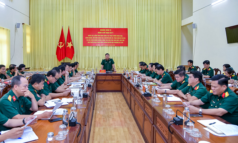 Quân khu 9 khảo sát, nắm tình hình công tác đổi mới, sáng tạo, chuyển đổi số tại Bộ CHQS tỉnh Cà Mau. (Ảnh do Bộ CHQS tỉnh cung cấp)