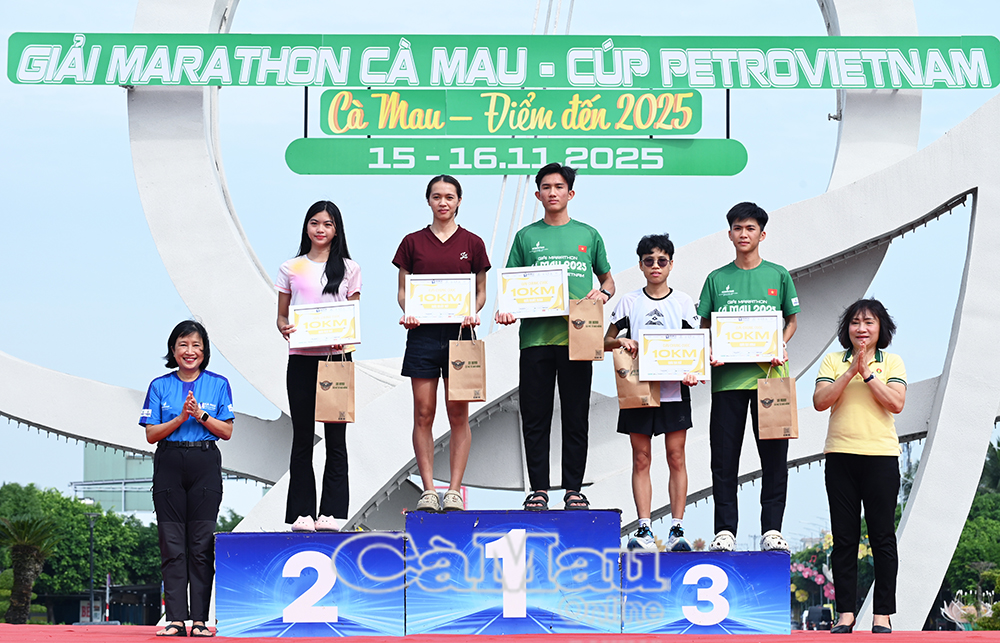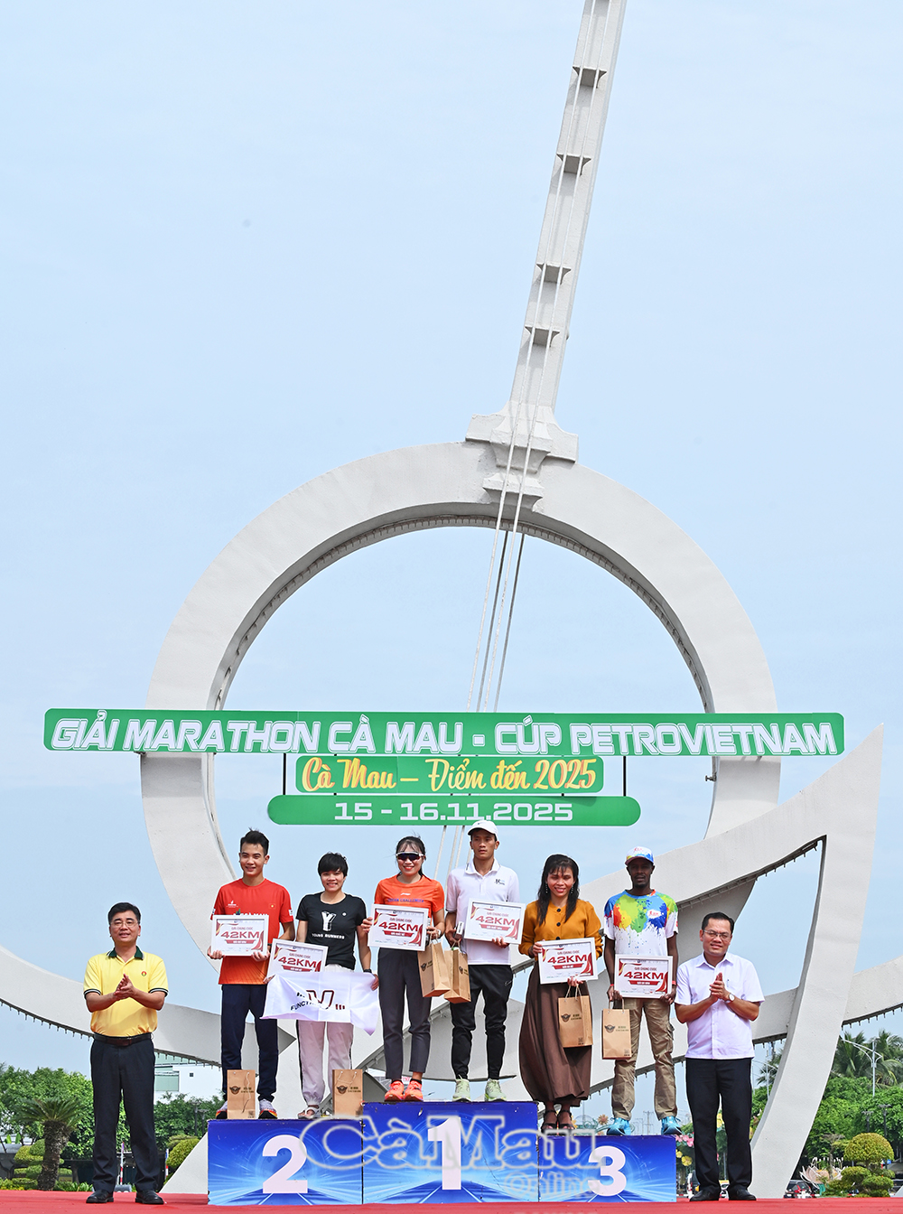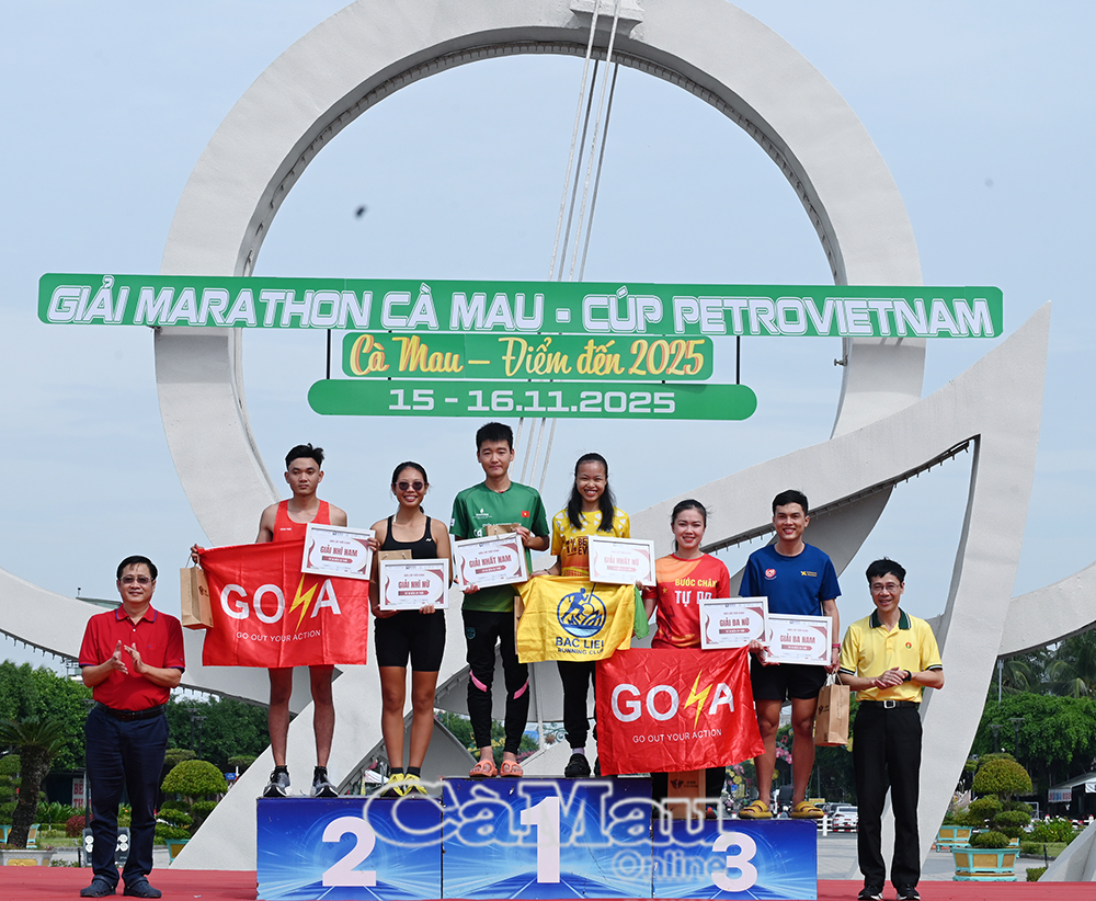 Báo Cà Mau Trưa 16/11, tại Quảng trường Hùng Vương (phường Bạc Liêu), Giải Marathon Cà Mau lần thứ 4 - Cúp Petro Vietnam, thuộc chuỗi hoạt động Ngày hội Cua Cà Mau lần thứ II - 2025, đã khép lại thành công và tiến hành trao thưởng cho các vận động viên đạt thành tích ở từng cự ly.