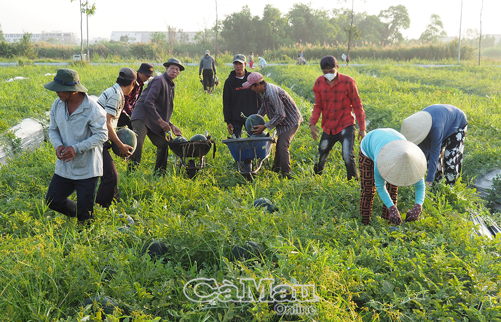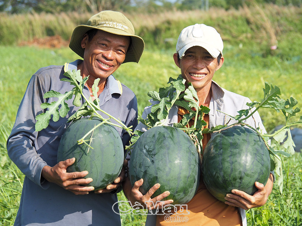 Anh Phạm Hoàng Á, khóm Xóm Lớn, Phường Lý Văn Lâm (bìa phải), phấn khởi khi 4 công dưa hấu năm nay mang về lợi nhuận trên 100 triệu đồng. Kinh nghiệm hơn 20 năm trồng dưa hấu đã giúp anh làm chủ kỹ thuật, cung cấp cho thị trường Tết những trái dưa chất lượng.