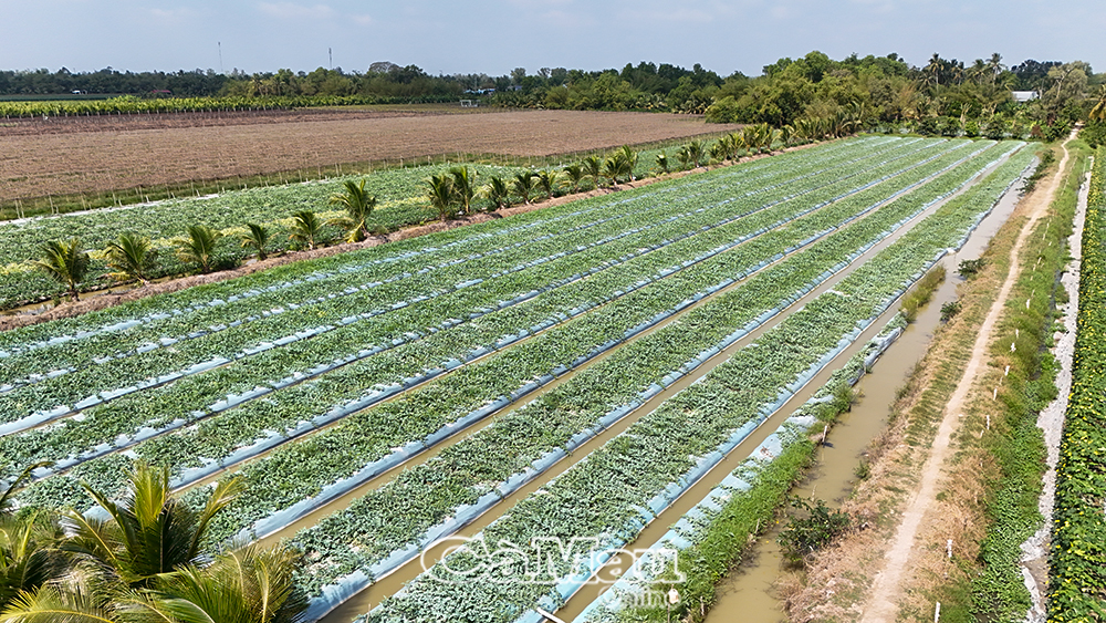 Ruộng dưa 5 công với khoảng 3.800 dây của ông Nguyễn Khánh An (khóm Thạnh Điền, Phường Lý Văn Lâm) đang cho thu hoạch. Với giá bán dao động từ 60.000-75.000 đồng/trái, ông An dự kiến thu lãi trên 150 triệu đồng sau khi trừ chi phí.
