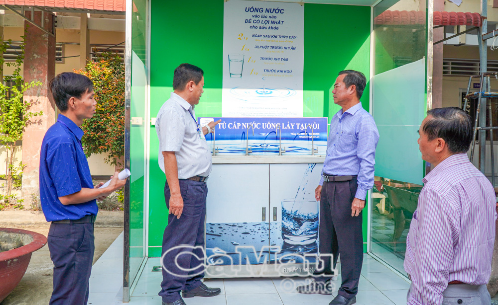Đoàn khảo sát thực tế hệ thống nước uống sạch cho học sinh tại Trường THCS và THPT Lý Văn Lâm.