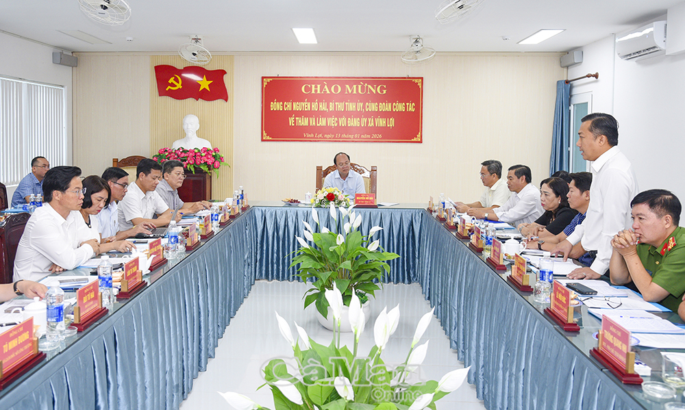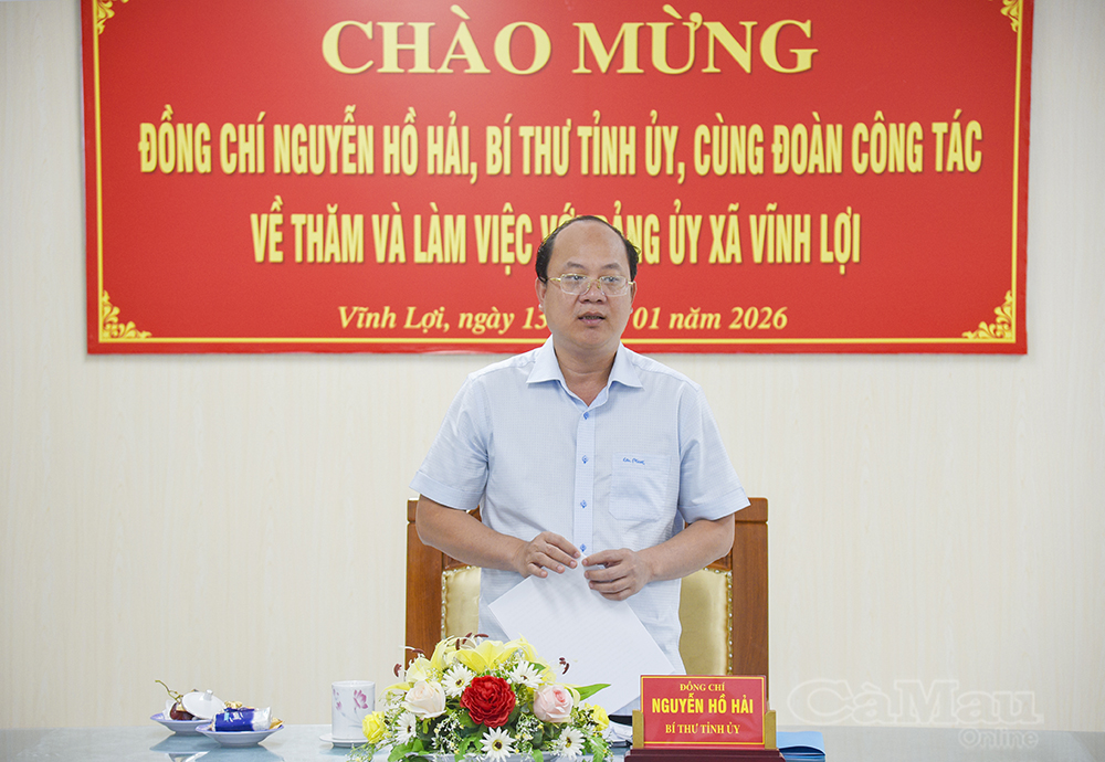 Báo Cà Mau Chiều 13/1, đồng chí Nguyễn Hồ Hải, Bí thư Tỉnh uỷ Cà Mau có buổi làm việc với Đảng uỷ xã Vĩnh Lợi về kết quả thực hiện nhiệm vụ chính trị, phát triển kinh tế - xã hội và vận hành chính quyền địa phương 2 cấp từ khi triển khai đến nay.
