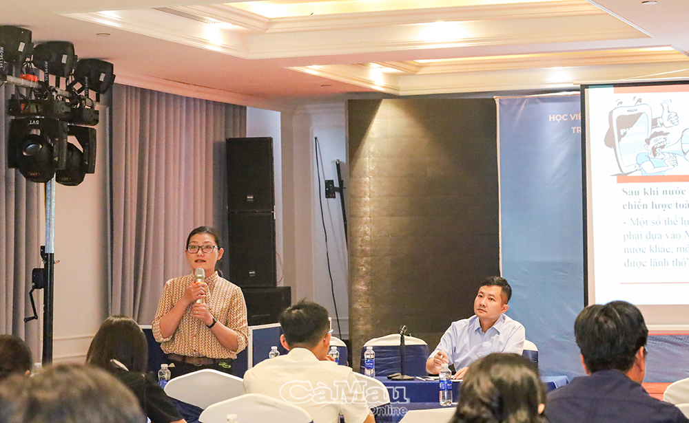 Học viên Nguyễn Thuỳ Trang, Trung tâm Văn hoá, Thể thao và Truyền thông phường Vĩnh Trạch, chia sẻ ý kiến về truyền thông trong công tác ngoại giao.