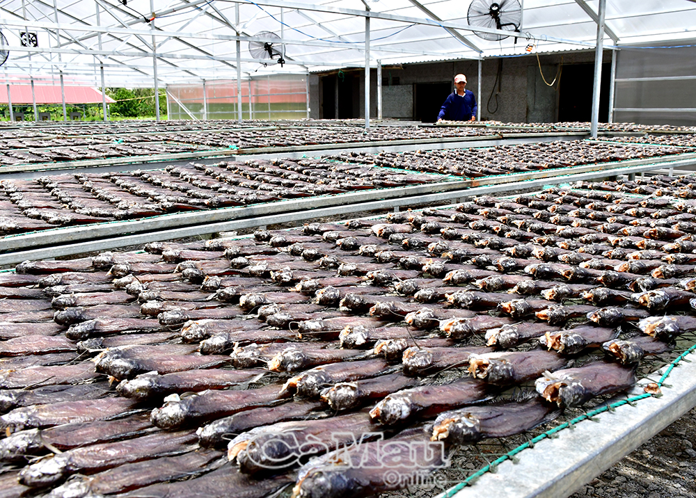 Nhiều cơ sở chế biến khô cá bổi ở Cà Mau lắp đặt hệ thống phơi năng lượng mặt trời, vừa đảm bảo vệ sinh an toàn thực phẩm, vừa ổn định sản lượng cung ứng ra thị trường bất kể thời tiết.