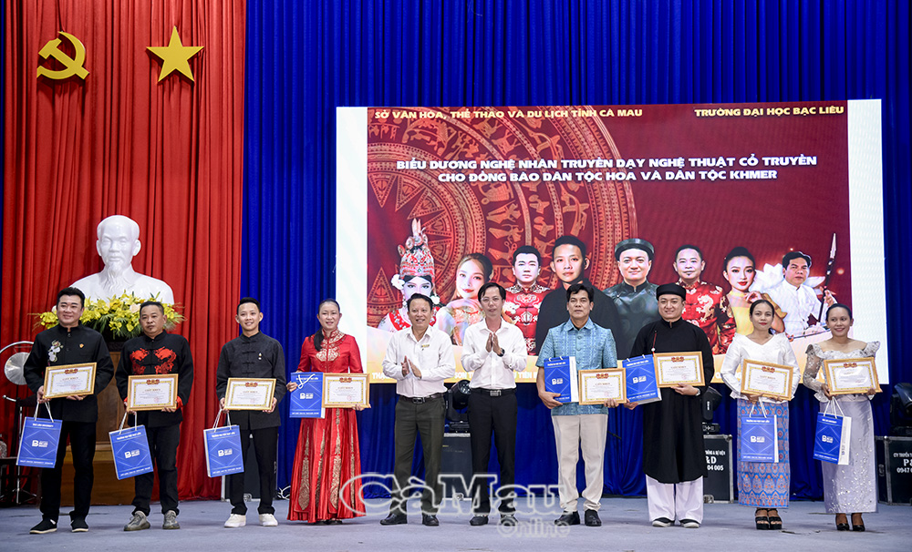 Dịp này, Ban Tổ chức tặng giấy khen cho các nghệ nhân có đóng góp trong truyền dạy nghệ thuật dân tộc Khmer và Hoa.