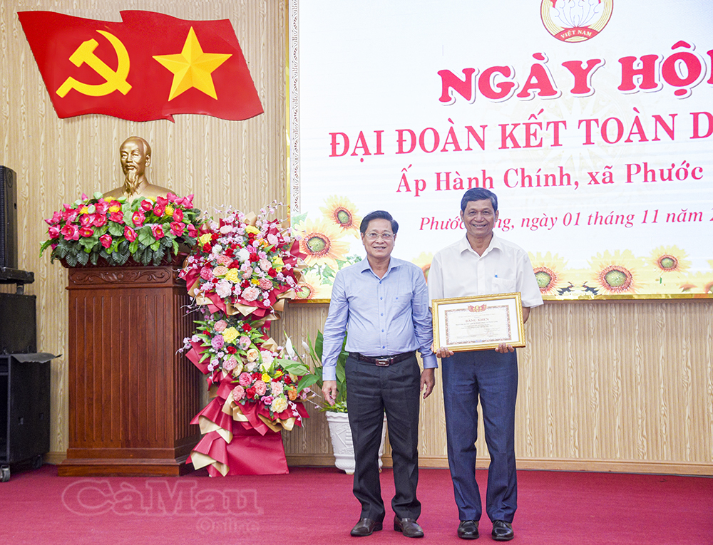 Phó Chủ tịch HĐND tỉnh Bùi Tấn Bảy tặng bằng khen của Uỷ ban MTTQ Việt Nam tỉnh Cà Mau cho ấp Hành Chính.