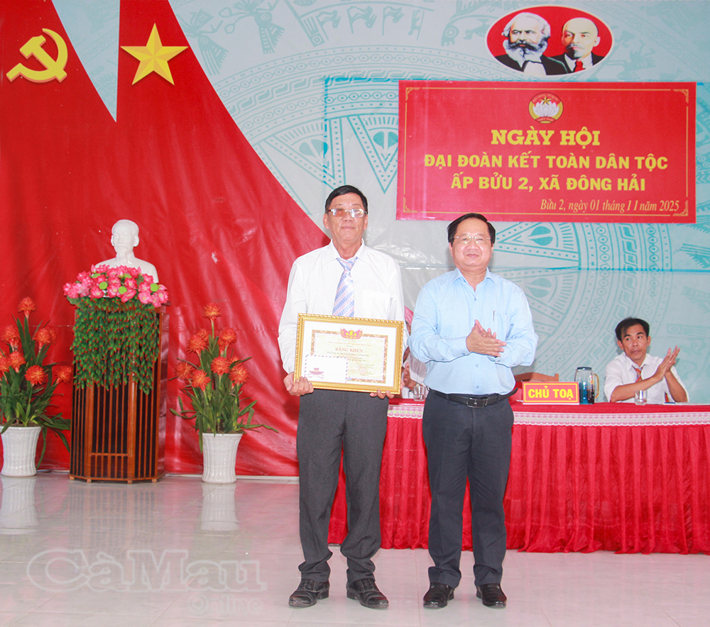 Đồng chí Lê Thanh Triều trao bằng khen của Uỷ ban MTTQ Việt Nam tỉnh Cà Mau cho Ban công tác Mặt trận ấp Bửu 2, xã Đông Hải vì có thành tích xuất sắc trong công tác Mặt trận năm 2025.