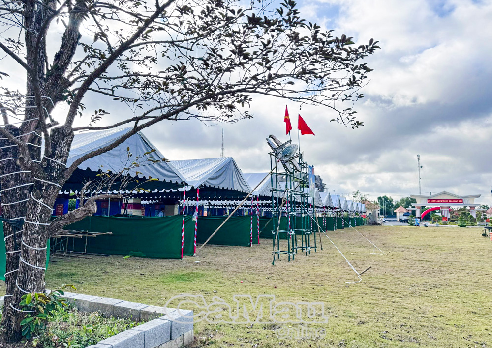 Khu vực hội trại tòng quân đang được hoàn thiện, tạo khí thế trang trọng, phấn khởi trước ngày tiễn thanh niên lên đường nhập ngũ.