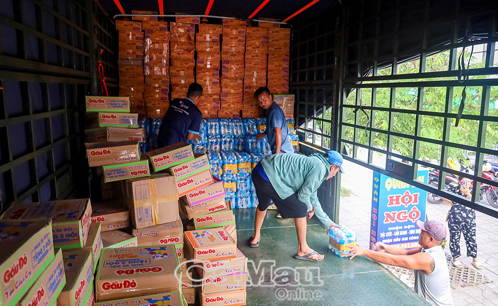 Những thùng hàng, bao gạo, thùng mì được người dân và lực lượng hỗ trợ chuyền tay nhau đưa lên xe, chuẩn bị cho hành trình dài hơn 1.000 cây số. Mỗi phần quà là tấm lòng sẻ chia của người dân vùng biển Cà Mau, gửi đến đồng bào miền Trung ruột thịt.