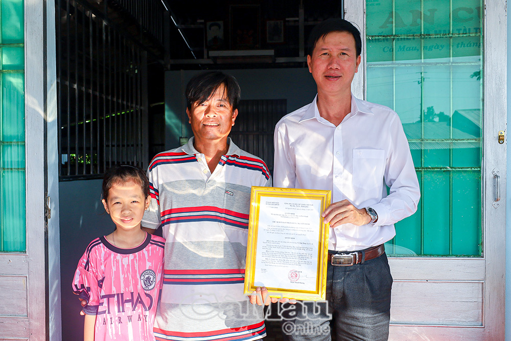 Ông Nguyễn Minh Đặng, Trưởng phòng Văn hoá - Xã hội xã Nguyễn Phích, trao Quyết định bàn giao nhà cho gia đình anh Võ Văn Thoại.