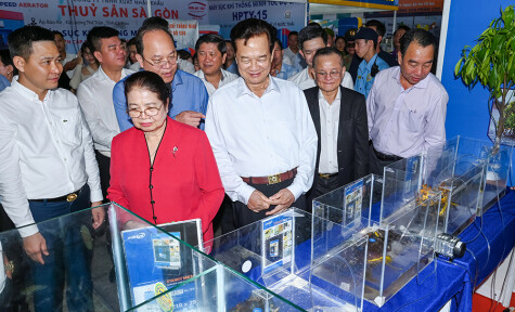 Nguyên Thủ tướng Chính phủ Nguyễn Tấn Dũng (giữa) tham quan không gian trưng bày mô hình nuôi tôm siêu thâm canh không xả thải, thân thiện với môi trường.