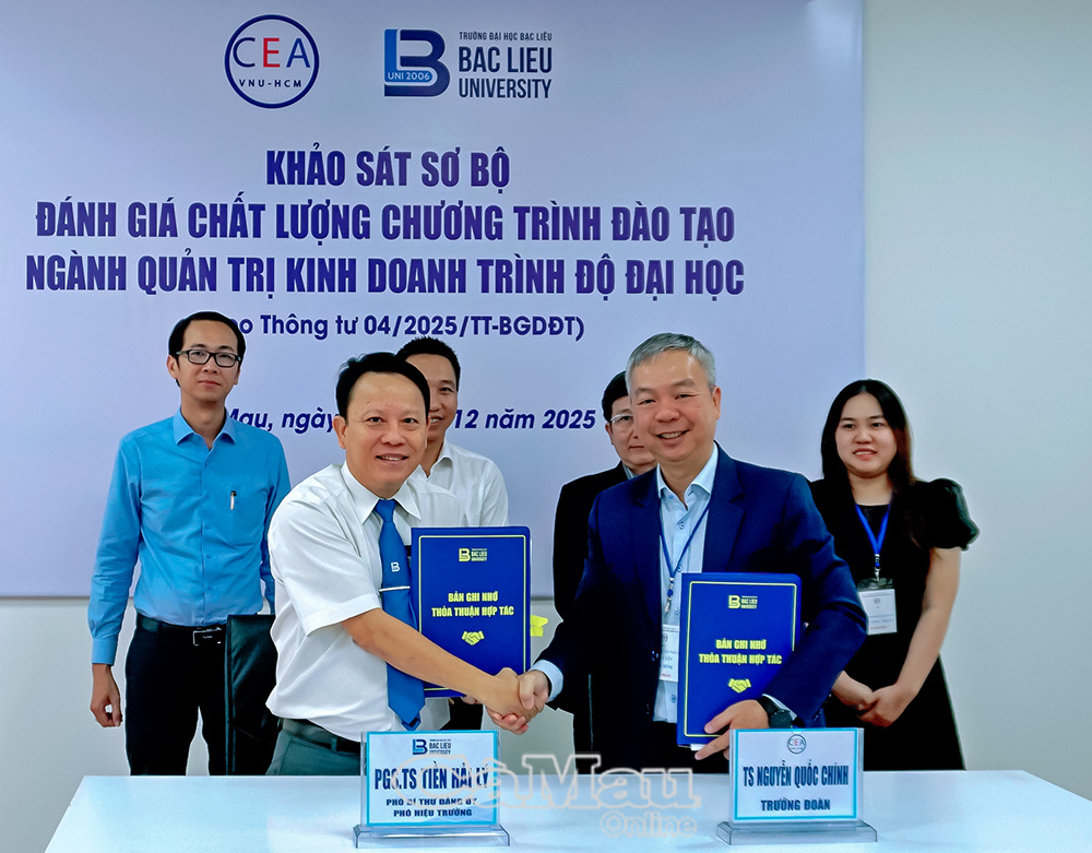 PGS.TS Tiền Hải Lý, Phó Hiệu trưởng Trường Đại học Bạc Liêu và TS. Nguyễn Quốc Chính, Trưởng đoàn công tác của Trung tâm Kiểm định chất lượng giáo dục, Đại học Quốc gia Hồ Chí Minh ký kết Bản ghi nhớ thoả thuận hợp tác ngày 19/12/2025 (Ảnh nhân vật cung cấp).