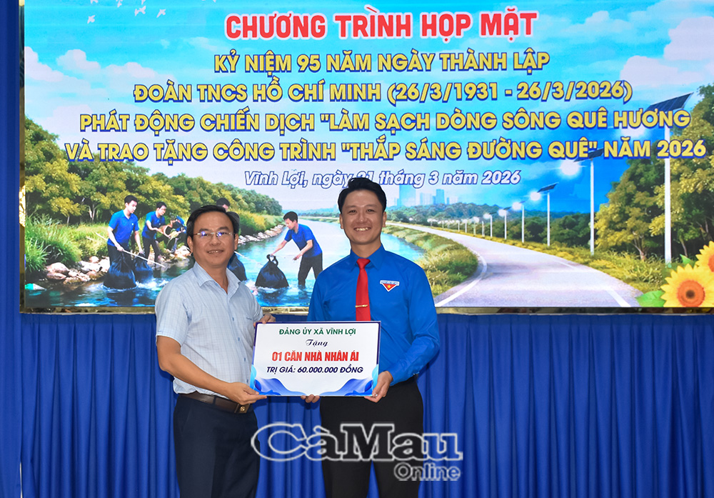 Báo Cà Mau Sáng 21/3, tại xã Vĩnh Lợi, Cụm hoạt động và thi đua số 1 (Tỉnh đoàn Cà Mau) tổ chức họp mặt kỷ niệm 95 năm Ngày thành lập Đoàn Thanh niên Cộng sản Hồ Chí Minh (26/3/1931-26/3/2026), phát động chiến dịch bảo vệ môi trường và trao tặng công trình “Thắp sáng đường quê”.