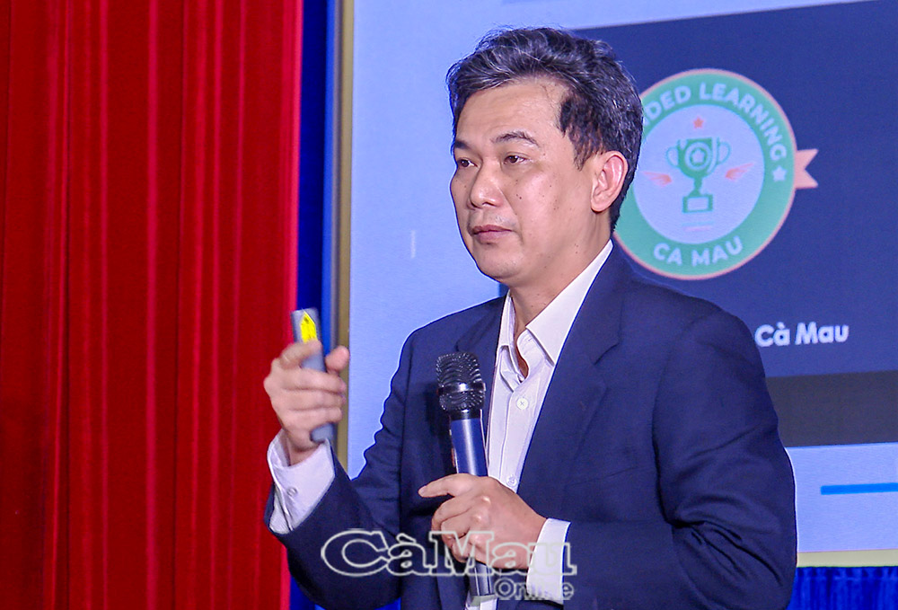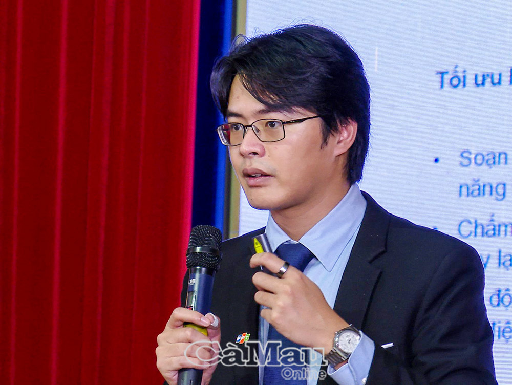 PGS.TS Huỳnh Anh Huy, Hiệu Trưởng Trường Sư phạm Đại học Cần Thơ, tham luận về: “Xây dựng đội ngũ nhà giáo đáp ứng yêu cầu chuyển đổi số để đột phá phát triển giáo dục và đào tạo Cà Mau”.