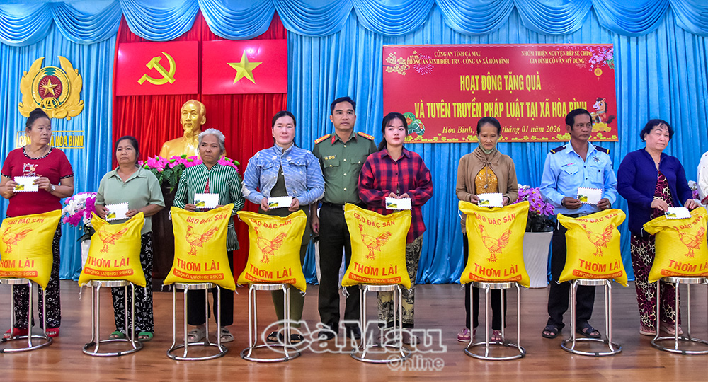 Báo Cà Mau Ngày 24/1, Phòng An ninh điều tra, Công an tỉnh Cà Mau phối hợp với công an địa phương và Nhóm thiện nguyện “Bếp sẻ chia”, mạnh thường quân tổ chức nhiều hoạt động an sinh trên địa bàn xã Hoà Bình.