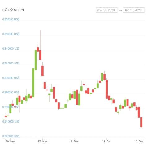 Biểu đồ giá STEPN (GMT) tính theo tháng, giá liên tục có dấu hiệu đi xuống. (Ảnh chụp từ trang https://www.coingecko.com)