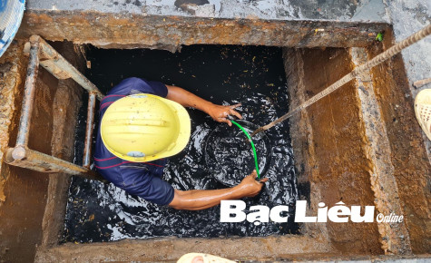 Công nhân Đội thoát nước nạo vét bùn trên tuyến đường Lê Văn Duyệt (Phường 3, TP. Bạc Liêu). Ảnh: T.Q