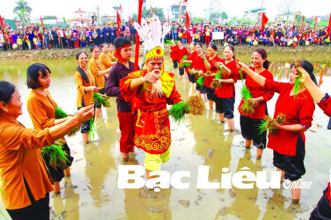 Tái hiện lại cảnh Vua Hùng dạy dân cấy lúa ở phường Minh Nông (TP. Việt Trì), tỉnh Phú Thọ. Ảnh: Anh Tuấn