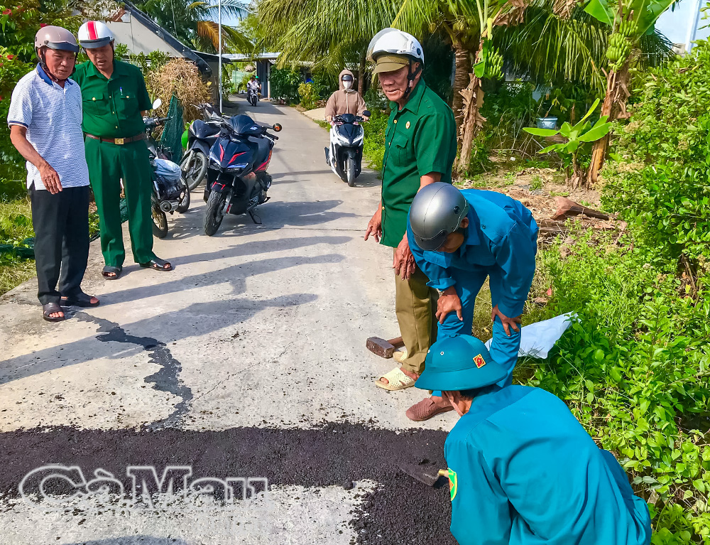 Cựu chiến binh ấp Tân An Ninh A phối hợp lực lượng Dân quân tự vệ vá đường.