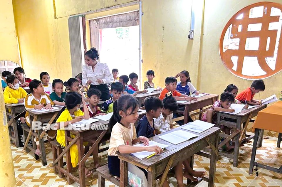Cô giáo Sô Phi dạy ngữ văn Khmer dịp hè 2024 tại chùa Mouni Serey Sophol (ấp Bình Bảo, xã Vĩnh Phú Tây, huyện Phước Long).