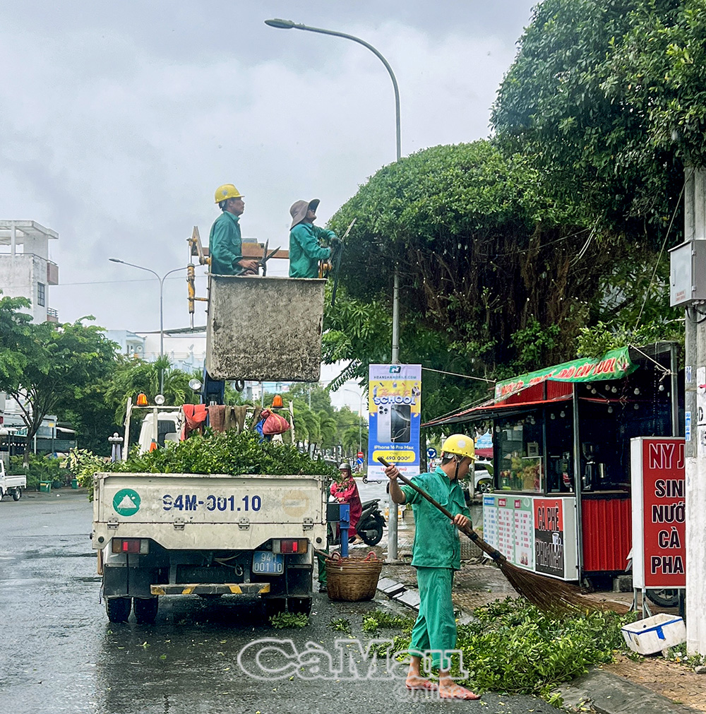 Công nhân Trung tâm dịch vụ đô thị tỉnh Cà Mau cắt tỉa cành nhánh để hạn chế sự cố cho người tham gia giao thông.