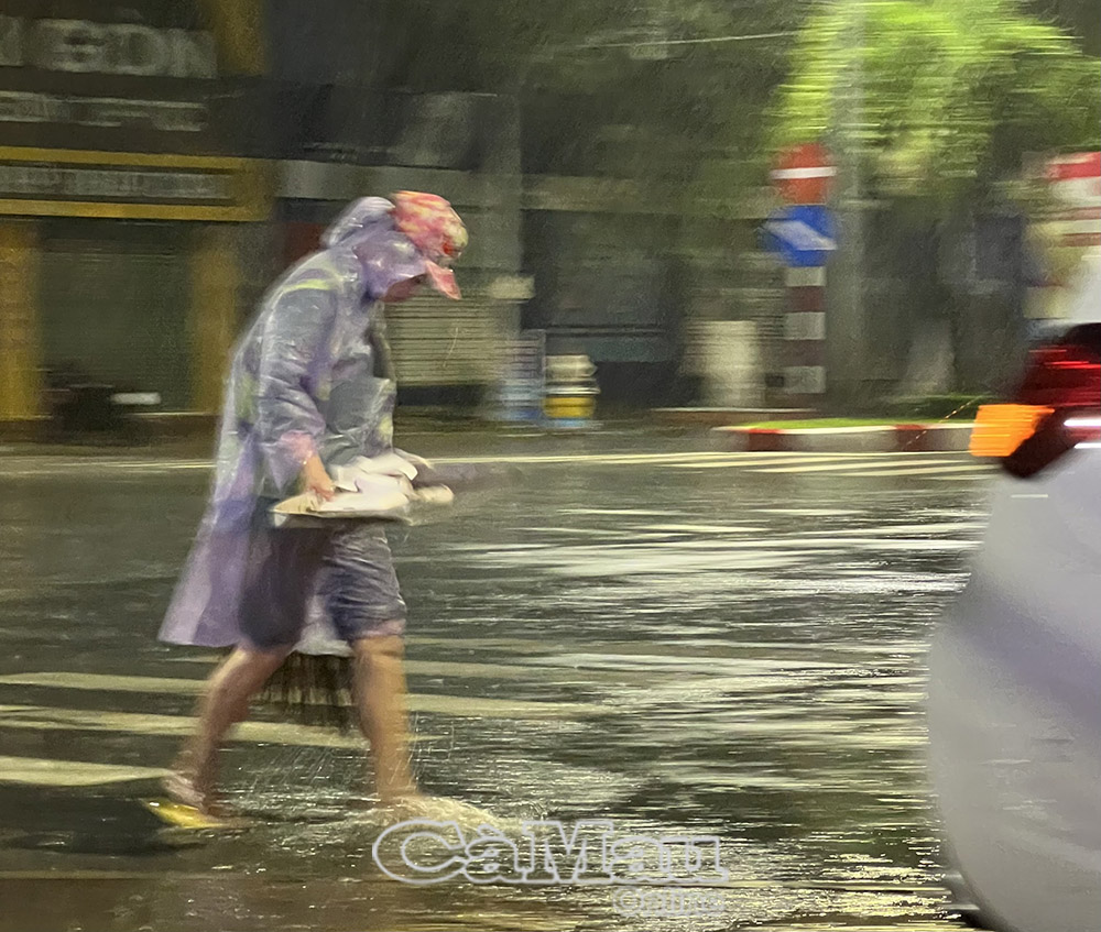 Với chiếc áo mưa mỏng tanh, người công nhân lặng lẽ làm việc trong đêm.