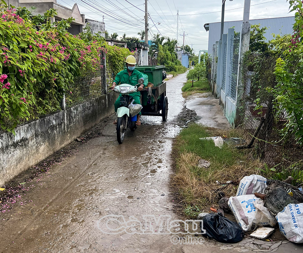 Anh công nhân len lỏi vào các con hẻm để thu gom rác của người dân.