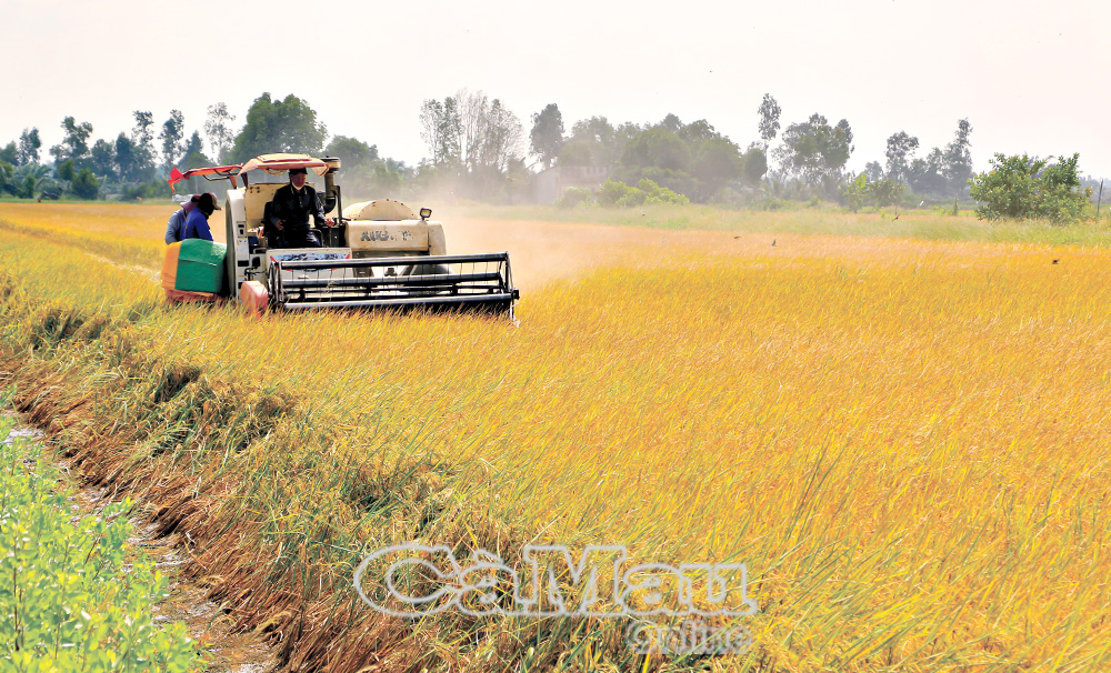 Ứng dụng cơ giới hoá thu hoạch lúa trên đất tôm tại xã Vĩnh Phước.