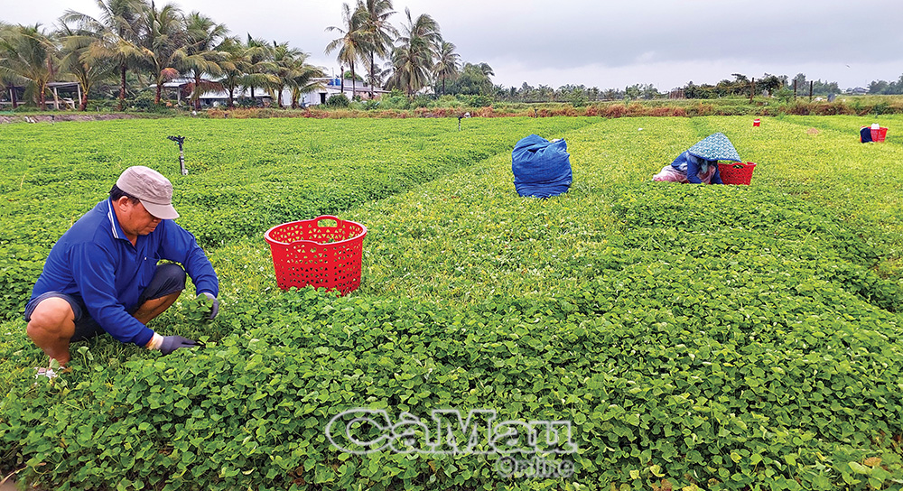 Nông dân xã Vĩnh Thanh thu hoạch rau má.