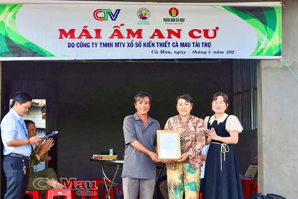 Bà Lê Cẩm Tha (bìa phải), Trưởng phòng Văn hoá - Xã hội xã Khánh An trao trao Quyết định tặng nhà Mái ấm an cư cho gia đình chị Trần Thị Danh