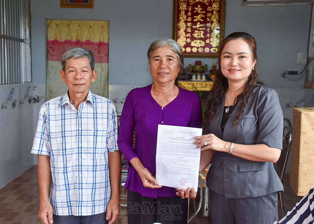 Bà Ngô Như Ý, Chủ tịch Uỷ ban MTTQ Việt Nam xã Châu Thới, trao quyết định bàn giao nhà cho gia đình ông Nguyễn Văn Hùng.