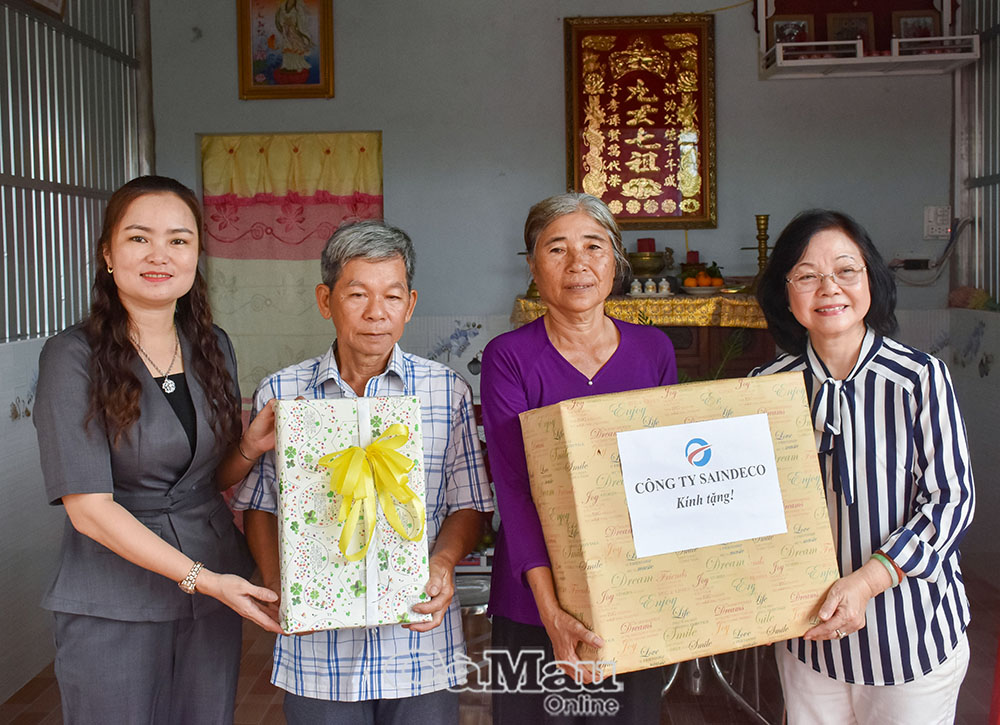Chủ tịch Uỷ ban MTTQ Việt Nam xã Châu Thới Ngô Như Ý (bìa trái) và bà Đổng Thị Kim Vui, đại diện Công ty Cổ phần Đầu tư Phát triển Công nghiệp SAINDECO, trao quà cho gia đình ông Hùng tại lễ bàn giao.