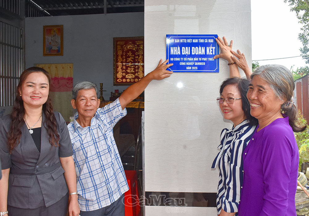 Bà Ngô Như Ý và bà Đổng Thị Kim Vui cùng gia đình ông Hùng gắn bảng nhà Đại đoàn kết.
